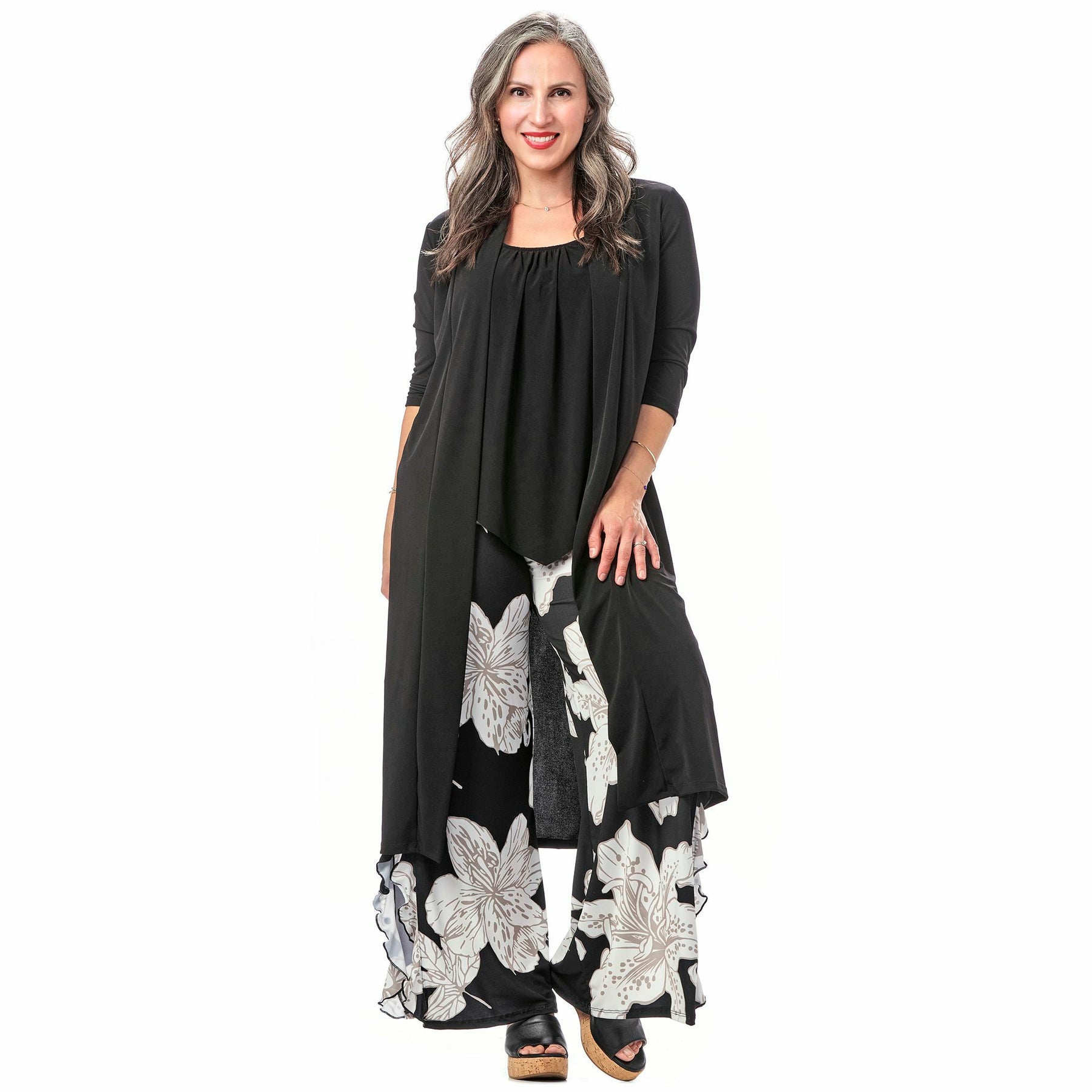 Introducing our fabulous Ruffled Pant, the latest addition to our incredible Sleek ITY bottoms collection! These pants are the epitome of comfort and style. Designed to flatter every body shape, the ruffled details add a touch of femininity and charm, making these pants a must-have for any fashion-forward individual. Perfect for your next resort getaway or cruise, this style pairs perfectly with Rapz style 4387, 4713, 4796 and 4725 tops. Our Ruffled Pant will keep you looking effortlessly chic all day long. Expertly crafted in Canada. Made with a luxurious blend of 96% Polyester and 4% Spandex, machine washable and perfectly packable. Pair with our 4387 ring coverlet style or any of our fabulous tops to create the look. Plus sizes available.